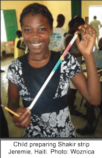 child preparing Shakir strip, Haiti, Global Education MagazineIn empowering children to act as agents of change, Child-to-Child helps children identify issues and actions they can take to affect the conditions in which they, their families and their community live. Child-to-Child employs a methodology that allows the children to set the agenda by stating and prioritizing those health and well-being issues that concern them the most. By naming the issues they will study and deciding upon the follow-up action, the children become owners of the program. Many of the themes selected are traditional health issues, but often children’s concerns reflect poverty, substance abuse, violence, and the breakdown of family and community. Safety problems range from the prevention of accidents to landmine awareness. Actions such as teaching through songs, skits or puppet shows require few resources and tap into the children’s creativity as they compose catchy health tunes or create puppets from discarded plastic bottles and other available materials. Older children have taught numeracy skills to younger children with stones and bottle caps and literacy skills through rhyming games.